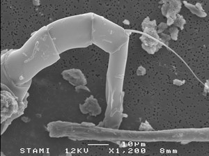Insect part in airborne grain dust collected during emptying of a barley stoarage bin.